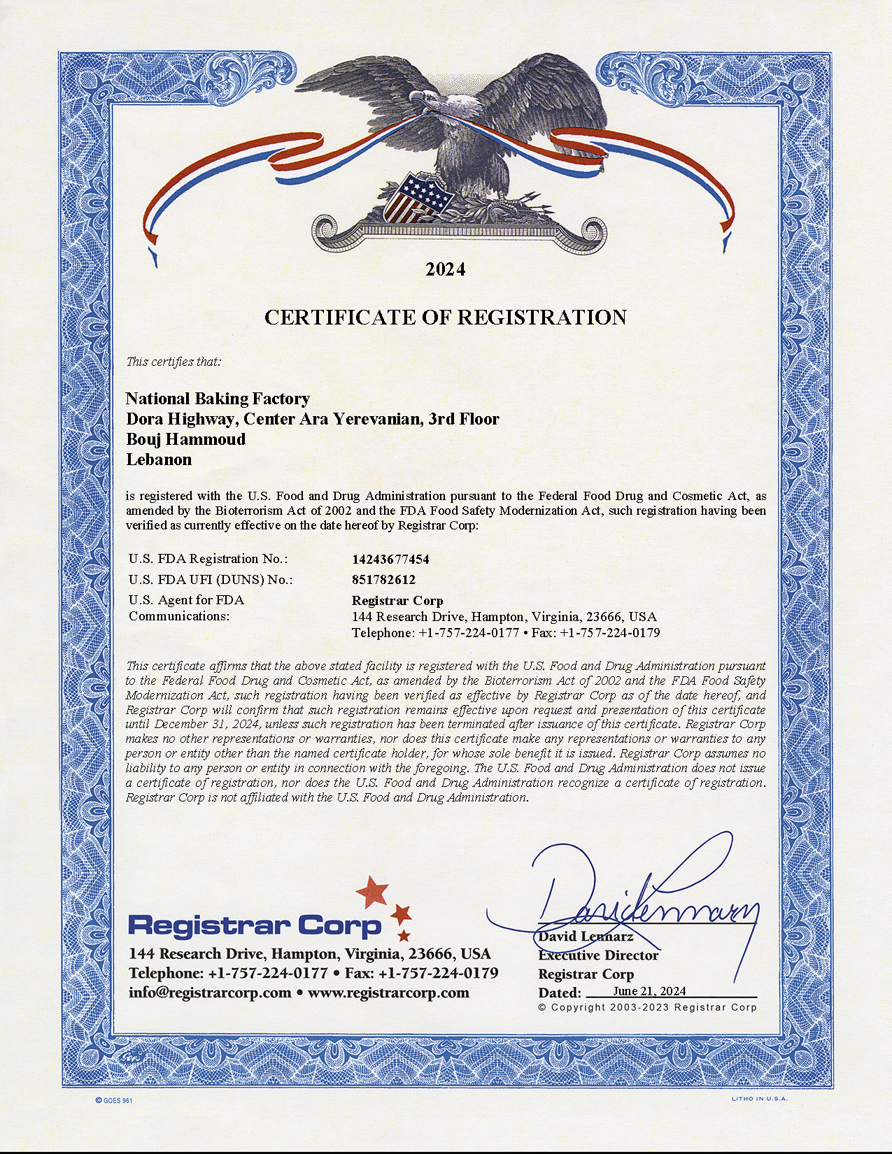 Food Facility Certificate of Registration